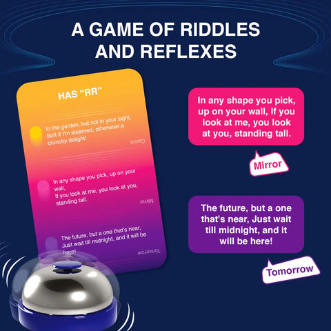 The goal is to be the first to collect 7 Game cards, but it’s likely you will find yourselves hooked and dinging much longer! Each card has 3 riddles, so the game solves for high repeatability too! This game is perfect for game nights with family or friends!