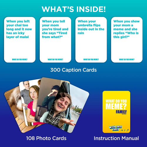 You’ll find 300 Caption Cards, 108 Photo Cards, and an instruction manual - everything you need for the funniest meme game night!